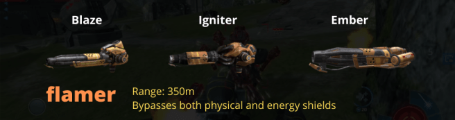 Flamers share plasma cannons’ 350m long brawling range. They can penetrate both physical and blue energy shields with flame streams capable of doing high DPS. The major drawback though is its projectile speed which is very slow and can be problematic against mobile bots. Because of this, it can be tricky to aim and require anticipating where the target is going.